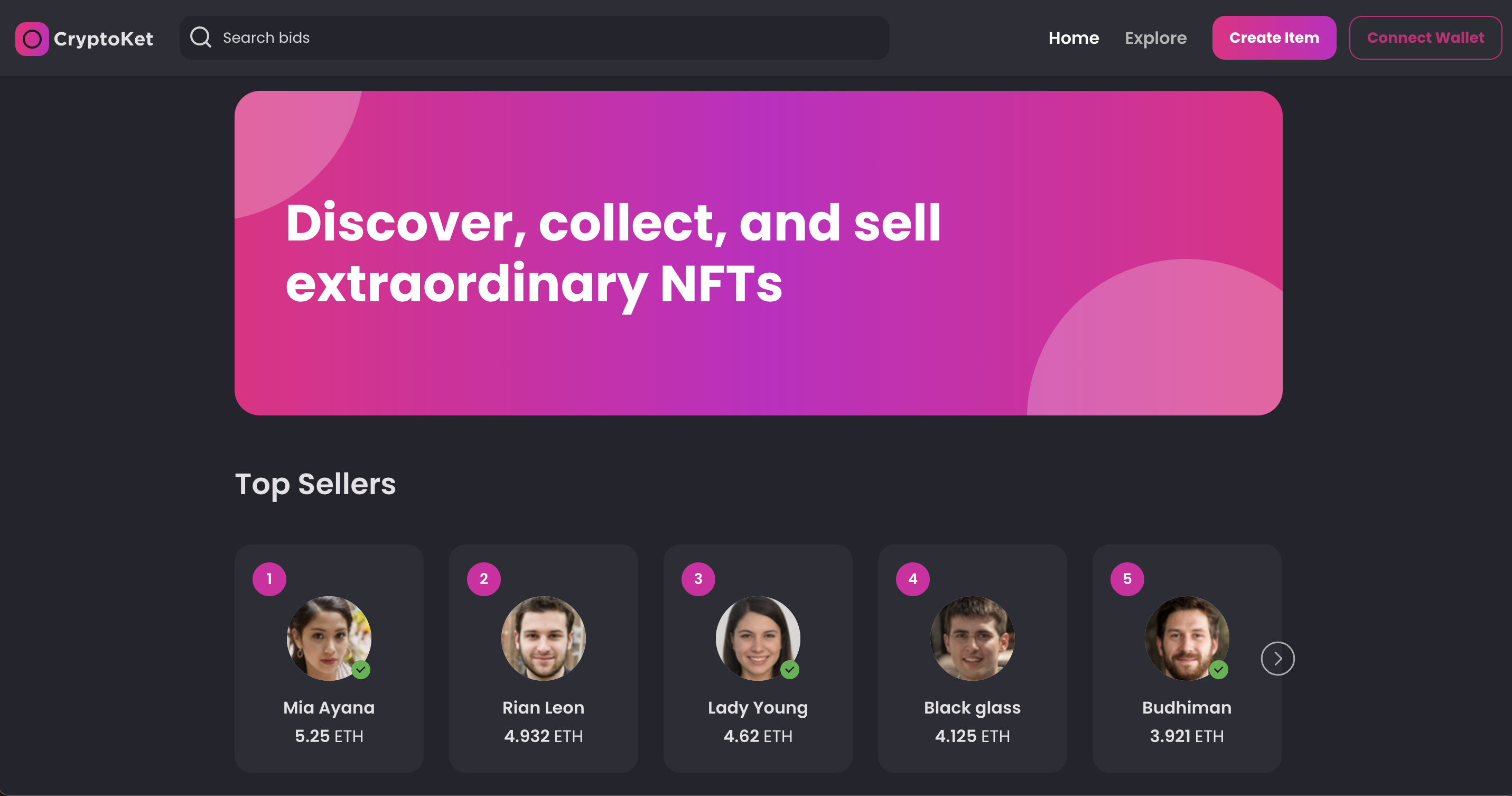 An NFT Marketplace related to NFT seller, hot bids, details of NFT profile, checkout and so on.